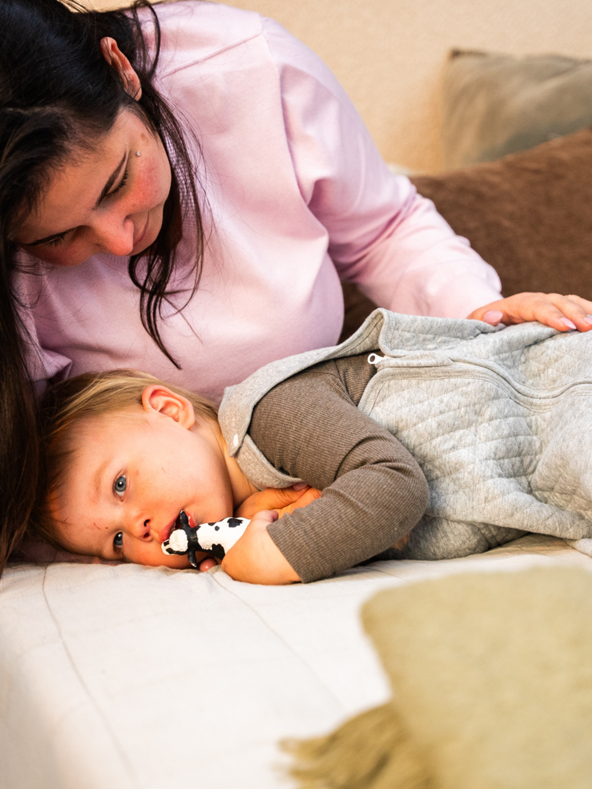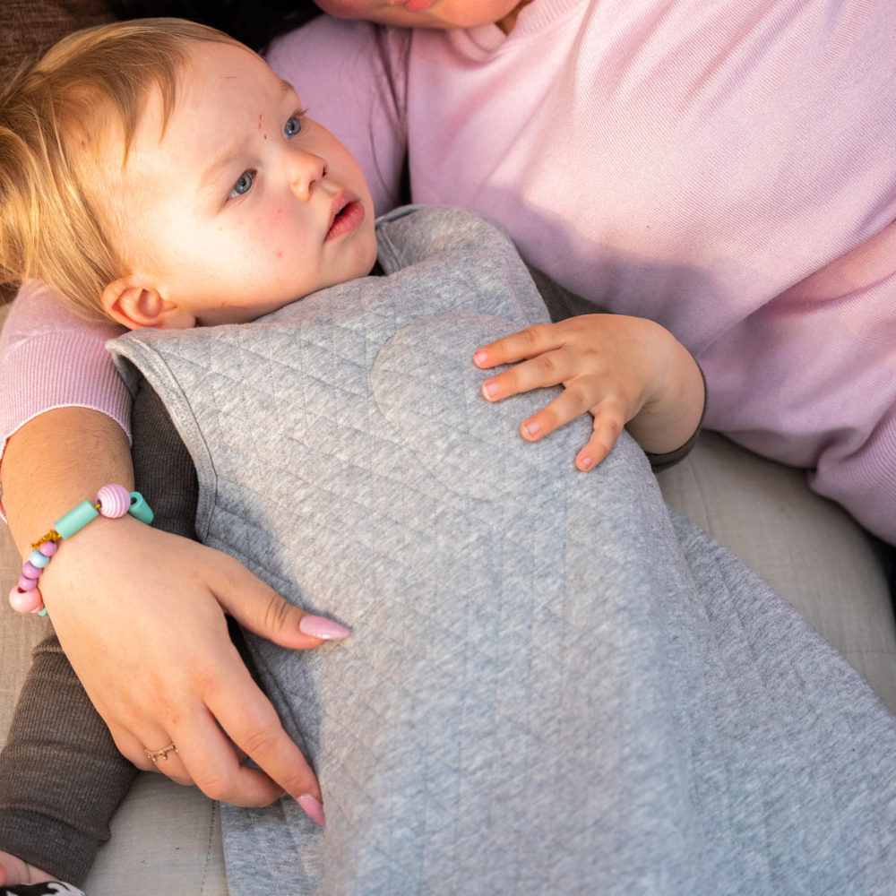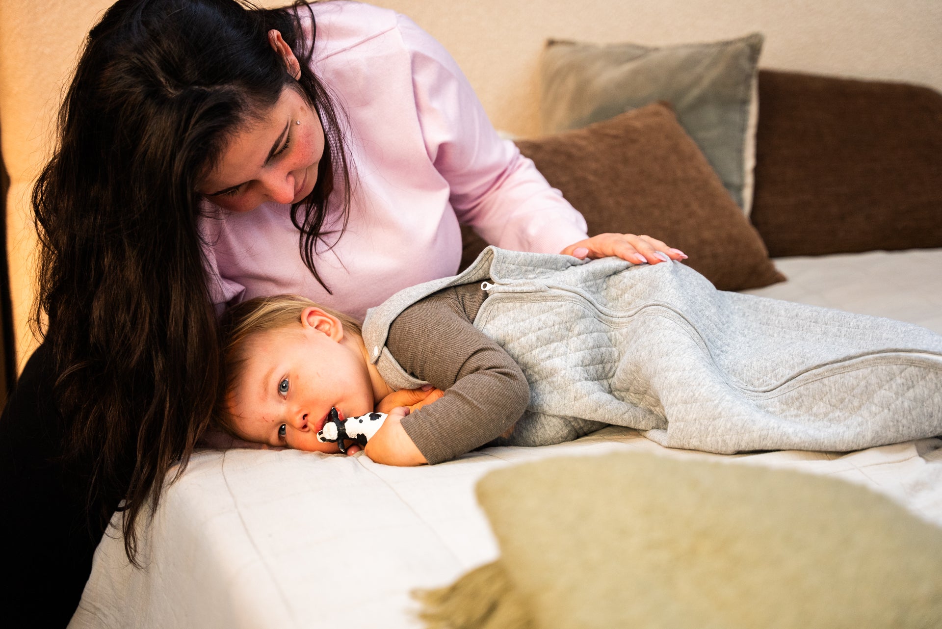 Drømmeposen™ har en diskret vægtet zone hen over brystet, der giver en blid, beroligende tryghed – som en forældres hånd. Det hjælper mange babyer med at falde til ro og sove længere.